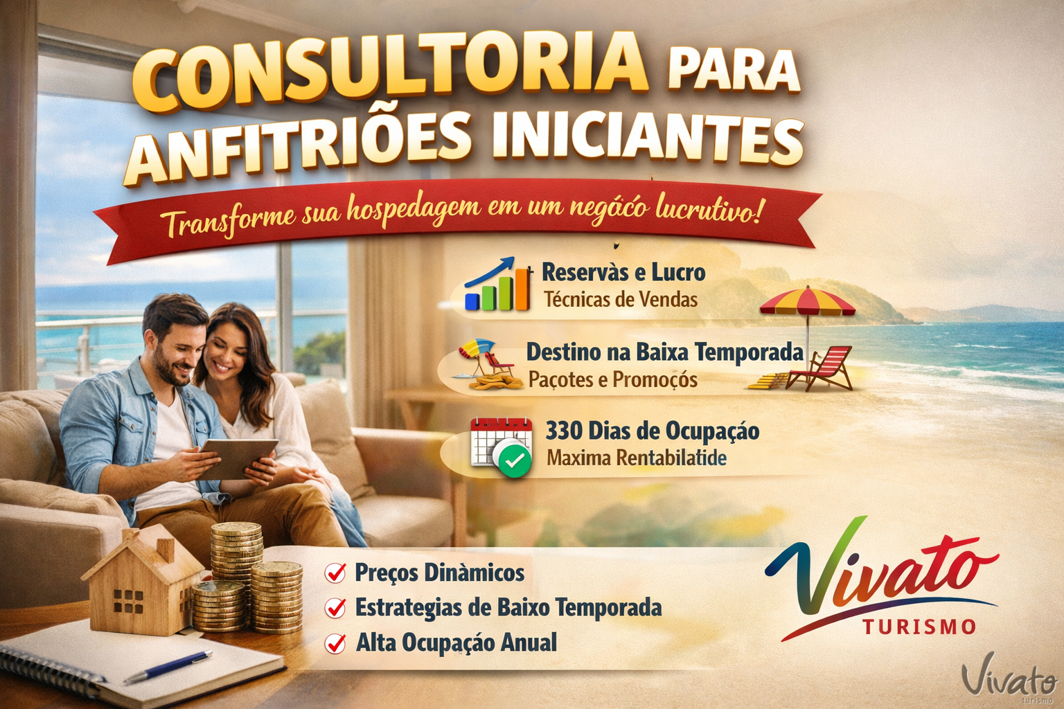 Coanfitrião Vivato: cadastro no Airbnb, estudo de mercado, contratos, suporte de 30 dias e gestão prática para maximizar lucros com seu imóvel.