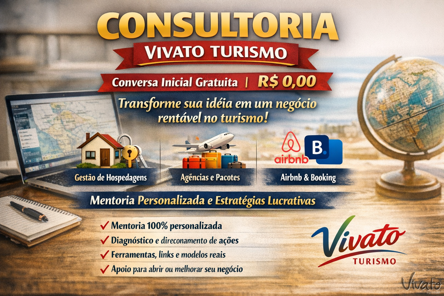 Consultoria Vivato Turismo: primeira conversa gratuita, mentoria personalizada e estratégias para transformar experiências em negócios rentáveis no turismo.