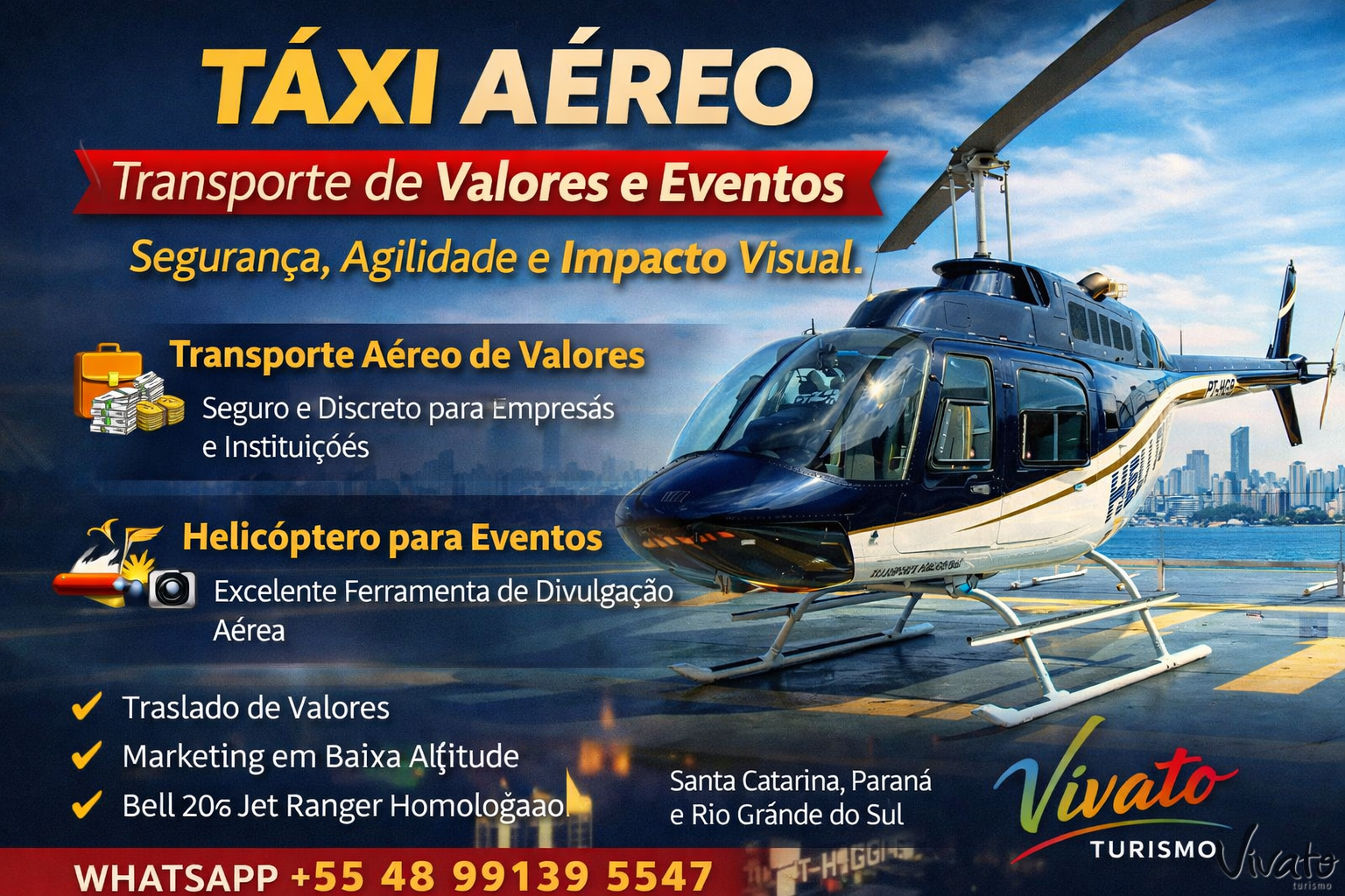 Táxi aéreo Vivato: transporte de valores e apoio a eventos com segurança, agilidade e impacto visual. Operações em SC, PR e RS.