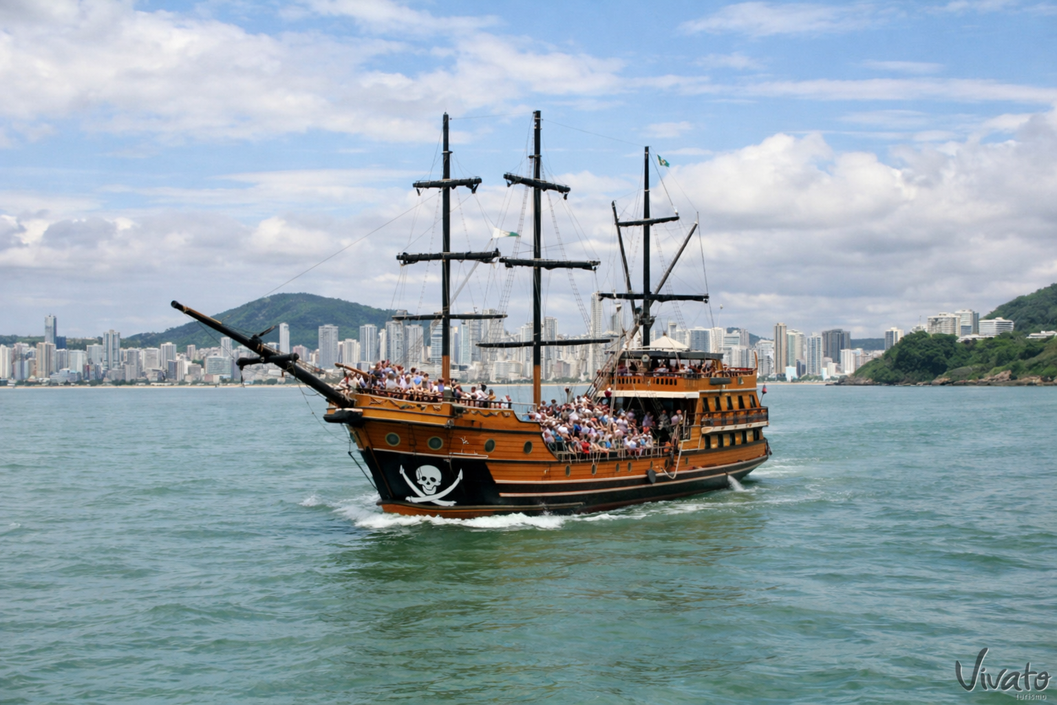 Passeio de Barco Pirata em Balneário Camboriú. Diversão temática, desembarque opcional em Laranjeiras e experiência inesquecível com Vivato Turismo.